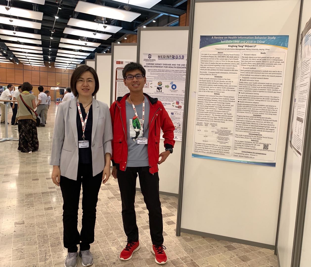 我系李世娟老师、唐星龙同学的合作学术海报《A Review on Health Information Behavior Study Between 1998 and 2018 in China》被MedInfo 2019正式录用并在专门的海报会议中进行展示和交流。这一研究成果得到了国内外同行的关注,在海报会议中也吸引了IBM公司医疗部门等不少感兴趣的机构前来进一步了解。