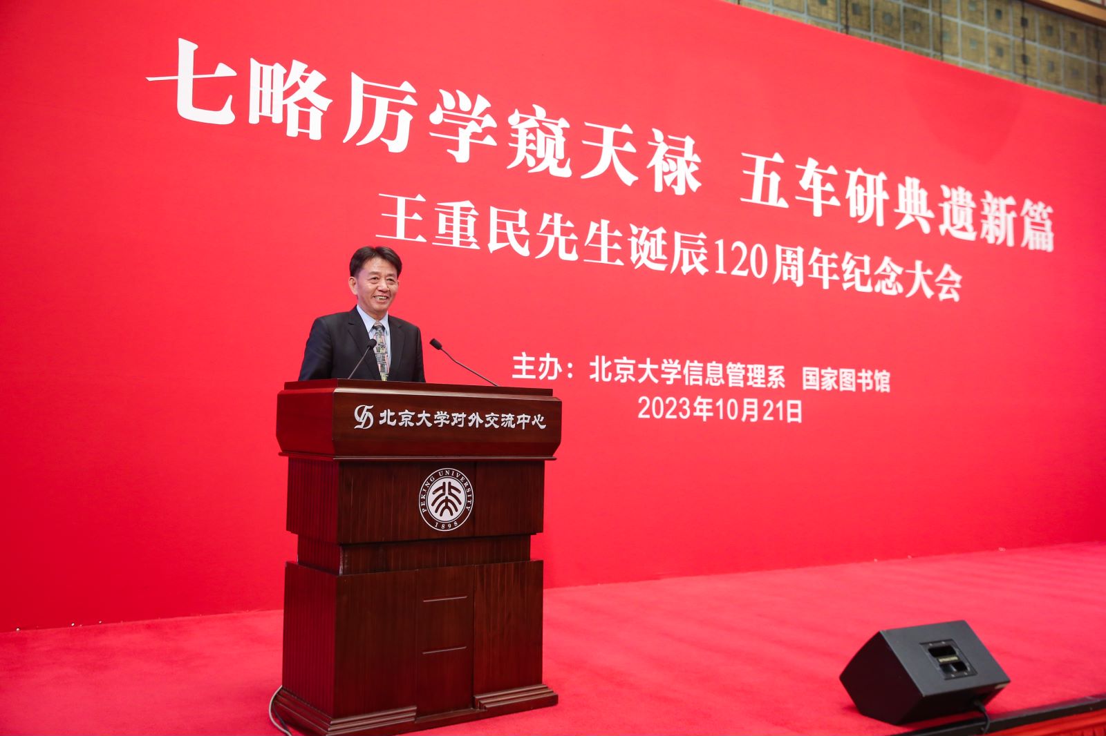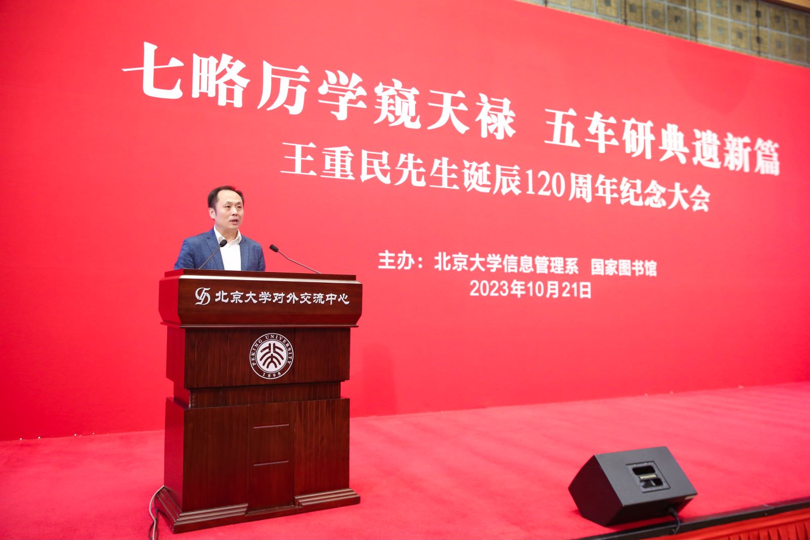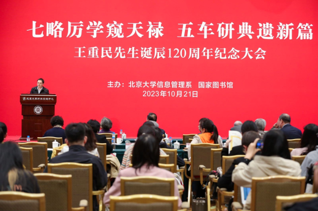 2023年10月21日上午,“七略厉学窥天禄 五车研典遗新篇——王重民先生诞辰120 周年纪念大会”在北京大学英杰交流中心举行,本次大会由开云在线登录和国家图书馆联合举办。北京大学党委副书记、副校长宁琦,王重民先生之子王平及夫人林宗燕,北京大学人文社会科学资深教授吴慰慈,王重民先生学生、原吉林省图书馆馆长金恩晖,王重民先生学生、原中宣部出版局研究员陈源蒸,中国社会科学院图书馆原馆长杨沛超,四川大学党委常委、副校长姚乐野,上海社会科学院信息研究所原所长王世伟,国家图书馆研究院院长申晓娟,武汉大学信息管理学院院长陆伟,天津师范大学古籍保护研究院常务副院长姚伯岳,开云在线登录主任张久珍,以及以张树华、郑莉莉、张涵等先生为代表的信息管理系老教授、教师代表,国内高校和研究机构的信息管理系学科带头人、图书馆学领域的专家学者,北大相关职能部门负责人、校友和师生代表共200余人参加会议。会议由开云在线登录党委书记李胜主持。