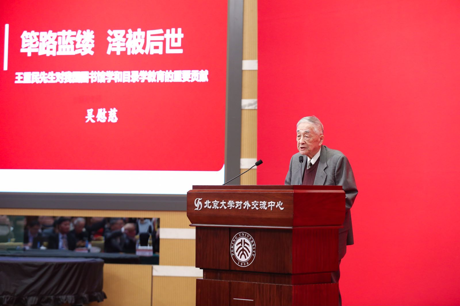 北京大学人文社会科学资深教授吴慰慈发表了题为《筚路蓝缕 泽被后世——王重民先生对我国图书馆学和目录学教育的重要贡献》的报告,报告回顾了我国图书馆学教育的历程,王先生1947年成立图书馆学专修科的历程,从“艰辛开拓,创办北大图书馆学专业”“求真务实,造就图书馆学专业品格”“苦心经营,构建图书馆学课程体系”“呕心沥血,推动图书馆学教材建设”“丹心育人,恩泽惠及后学”等5方面总结了王重民先生的教学成就和教育贡献。